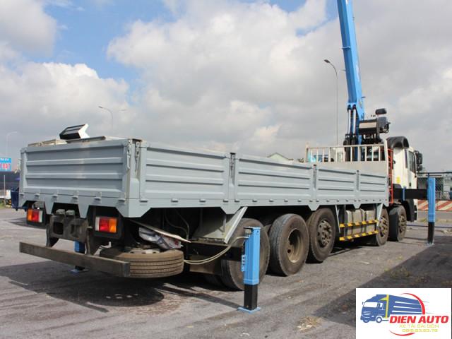 Xe tải Hyundai HD360 gắn cẩu Dongyang sau khi gắn cẩu có tải trọng cho phép chở 13900kg, kích thước lòng thùng hàng 8400 x 2350 x 650/— mm đáp ứng tốt nhu cầu chuyên chở hàng hóa với tải trọng nặng, đa dạng trên thị trường. Cẩu Dongyang 10 tấn 5 khúc SS1015 với thiết kế 5 đoạn có khối lượng nâng tối đa 1000kg tại 3m và 600kg tại 24,9m. Vận hành bằng thủy lực. Hệ thống điều khiển cần hiện đại, dễ dàng sử dụng.