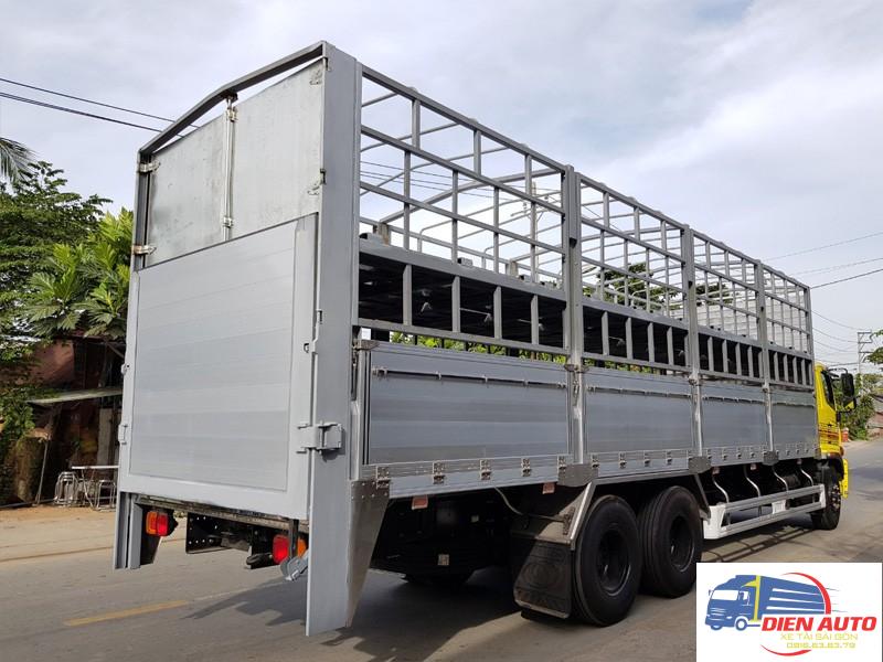 Thùng chở xe máy có cấu tạo rất chắc chắn đảm bảo quá trình chuyên chở xe máy tiện lợi và an toàn nhất, thùng chở xe máy của xe tải Hino FL8JW7A có kích thước lọt lòng thùng là 9350 x 2350 x 2600/—mm, tải trọng cho phép chở là 11700kg. Thùng được đóng đảm bảo theo tiêu chuẩn kỹ thuật của cục đăng kiểm vì thế đạt tiêu chuẩn chất lượng cao với độ bền lớn giúp cho khách hàng yên tâm hơn trong quá trình vận chuyển. Thùng có thiết kế gần giống thùng mui bạt nhưng được chia làm 2 tầng và có mui phủ bên trên nhằm giúp cho xe không bị ảnh hưởng bởi nước mưa hay ánh nắng trực tiếp chiếu vào, đảm bảo chất lượng hàng hoá. Lợi ích của thiết kế 2 tầng giúp chứa được nhiều xe hơn và trang bị thêm bửng nâng thuỷ lực giúp cho nâng hạ xe máy lên xuống thùng xe đơn giản và cực kỳ nhanh chóng, giảm bớt chi phí, thời gian cũng như sức lực, đem lại hiệu quả công việc cao.