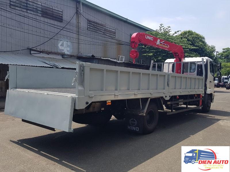 Cần cẩu Unic được gắn trên thùng lửng của chiếc xe tải Hino FC9JLTC, thùng xe được đóng mới 100% đạt tiêu chuẩn của cục đăng kiểm Việt Nam.