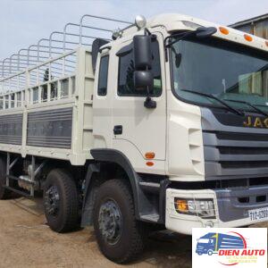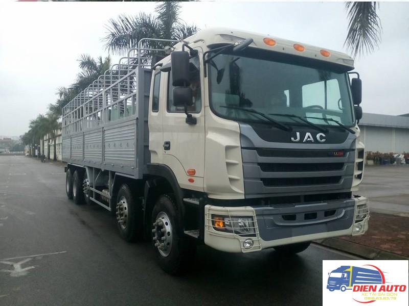 Cùng đại lý xe tải chúng tôi ngắm qua ngoại thất của chiếc xe tải Jac K5 5 chân 22 tấn thùng bạt này nha. Nhìn tổng quan thì xe tải Jac 5 chân có kiểu dáng hiện đại, mạnh mẽ. Cabin thế hệ mới được thiết kế theo kiểu khí động lực học giúp cản sức gió khi di chuyển, tiết kiệm nhiên liệu. Mặt ga lăng được gia cường chắc chắn, kết hợp với lưới tản nhiệt phía trước với nhiều khe thông gió giúp làm mát động cơ nhanh, tăng tuổi thọ động cơ. Hệ thống khung gầm chắc chắn được làm từ thép nguyên khối tăng độ bền bỉ, chịu tải tốt. Được phủ 1 lớp sơn tĩnh tiện chống bị ăn mòn, han gỉ do thời tiết.